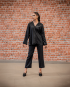 Solid Black Loose-Fit Kurta style made from premium Silk Karandi fabric, the shirt features a band collar and a sleek placket, offering a chic yet comfortable fit. Paired with matching trousers, this set combines elegance with ease.